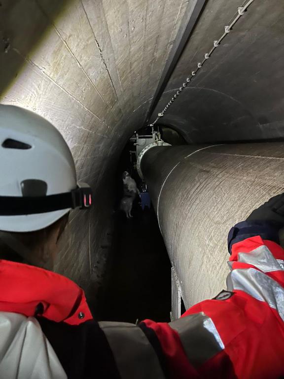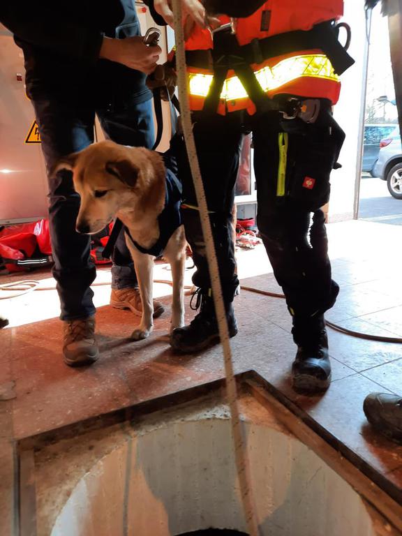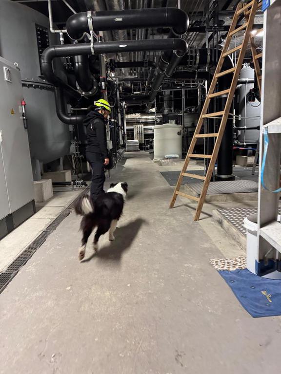 Am Freitagnachmittag mussten sich dann die Hundeführer zusammen mit ihrem Hund durch ein 60cm großes (oder sollte ich schreiben „60cm kleines“) Loch im Wasserkraftwerk Waldmünchen abseilen. Nach dem gemeinsamen Abseilen musste der Hund zeigen, dass er noch in der Lage war, zwei Versteckpersonen zu finden und das ohne jegliches Tageslicht. Am Samstagnachmittag war es dann zwar nicht mehr dunkel, dafür aber laut und warm, denn wir befanden uns unterhalb des Aqua-Fit Erlebnisbades in Waldmünchen. Hier mussten unsere Hunde wieder starke Nerven zeigen.