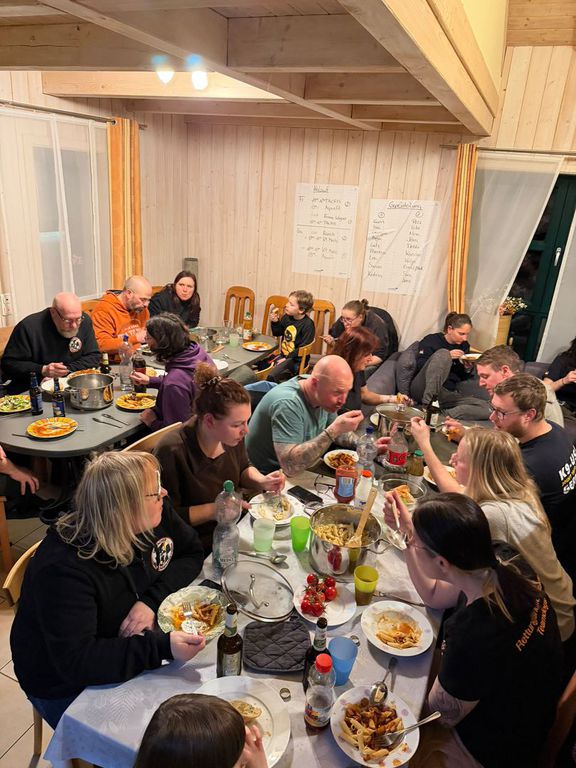Fast eine Woche wurde zusammen gekocht, gegessen und getrunken. Erfahrungen in unterschiedlichen Dialekten wurden ausgetauscht. Aber auch das Training mit den Hunden kam nicht zu kurz. Nachdem die Mehrzahl der Mitglieder bereits am Dienstag angereist war, ging es am Mittwoch gleich zu Bau Wagner. Dort konnten wir zwei Hallen und das Freigelände für unsere Zwecke nutzen. Am Donnerstag gingen wir mit den Hunden in die Dunkelheit. Die Further Felsengänge warteten darauf durch Hund und Mensch erkundet zu werden. Die Vormittage des Freitags und des Samstags waren der Theorie und der Vereinsbesprechung gewidmet. Hier wurden aktuelle Themen wie z.B. das Erdbeben vom 06.02.2023 in der Türkei und Syrien besprochen.